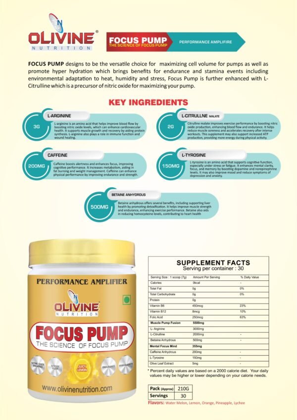 FOCUS PUMP designs to be the versatile choice for maximizing cell volume for pumps as well as promote hyper hydration which brings benefits for endurance and stamina events including environmental adaptation to heat, humidity and stress, Focus Pump is further enhanced with L-Citrulline which is a precursor of nitric oxide for maximizing your pump.