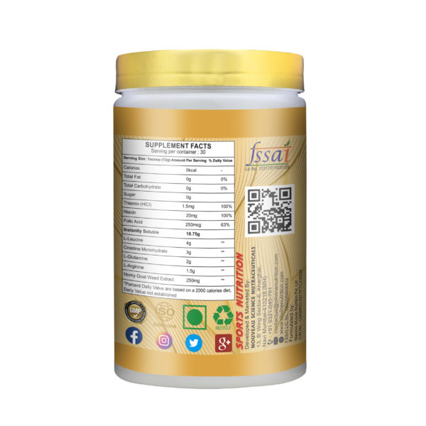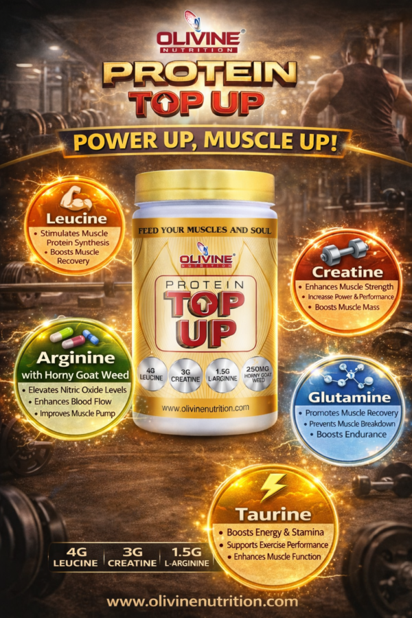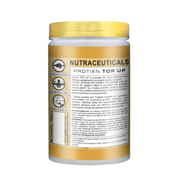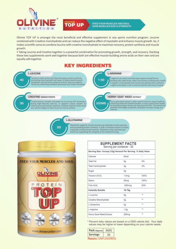 Olvine TOP UP is amongst the most beneficial and effective supplement in any sports nutrition program. Leucine combined with Creatine monohydrate can reduce the negative effect of myostatin and enhance muscle growth. So, it makes scientific sense to combine leucine with creatine monohydrate to maximize recovery, protein synthesis and muscle growth.